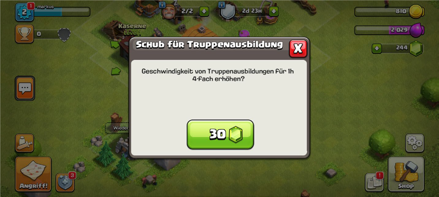 Auch ein schnelleres Vorankommen kann während des Spiels käuflich erworben werden. Die Spiele sind so gestaltet, dass man zwar auch ohne Geldeinsatz, aber nur sehr mühsam ein Ziel erreichen kann. Befragte gaben an, dass die Investition von Geld in das Spiel als die sinnvollere Art wahrgenommen wird, Spielfortschritte zu erleben, da das Erspielen als langwierig und mühsam erfahren wird – der Spielfluss wird also vom Hersteller so verlangsamt, dass das Spielen selbst als unangenehm und ein Kauf als sinnvoll erlebt wird.